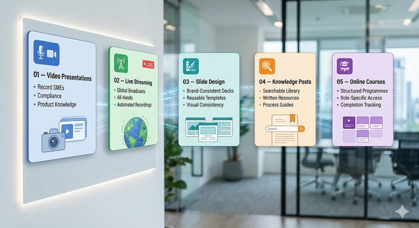 | Product knowledge updates | Mass meetings or manually redistributed decks | Updated video post published once, accessed by all |