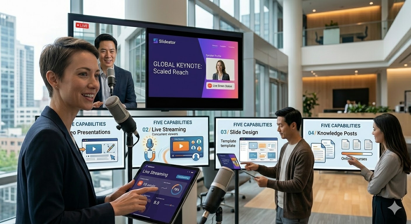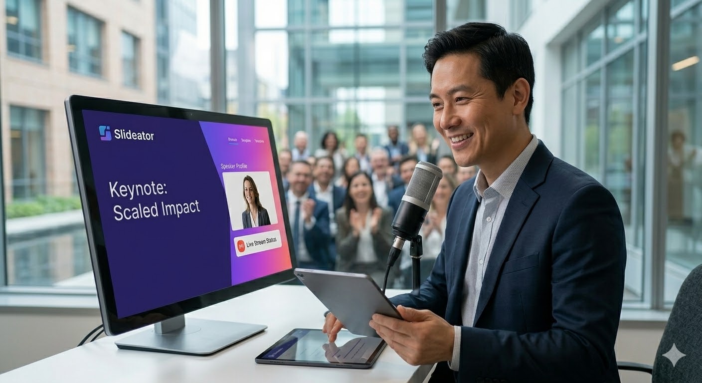 Slideator is the platform for professional speakers who want to translate the impact of a live keynote into a permanent, scalable, monetisable digital presence — without needing a film crew, a developer, or five different tools.