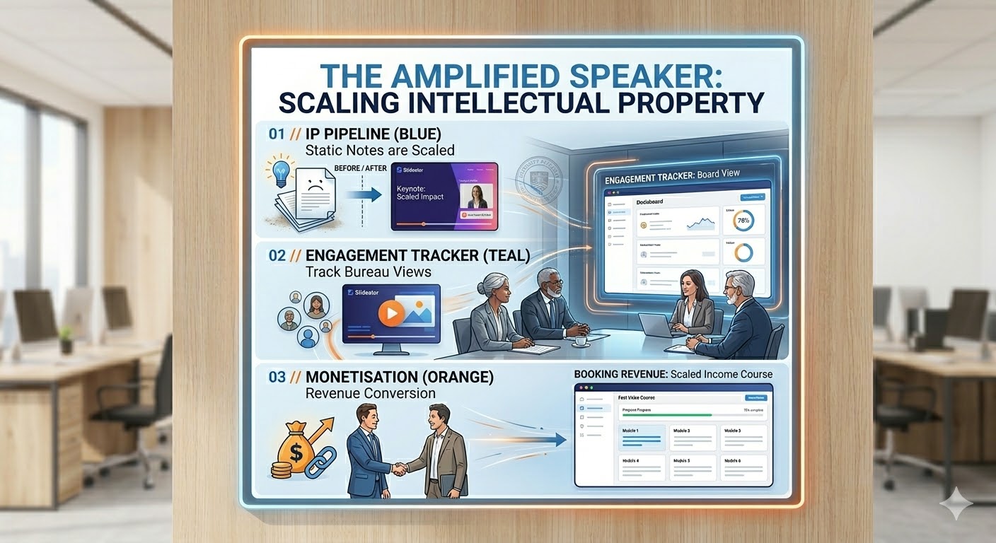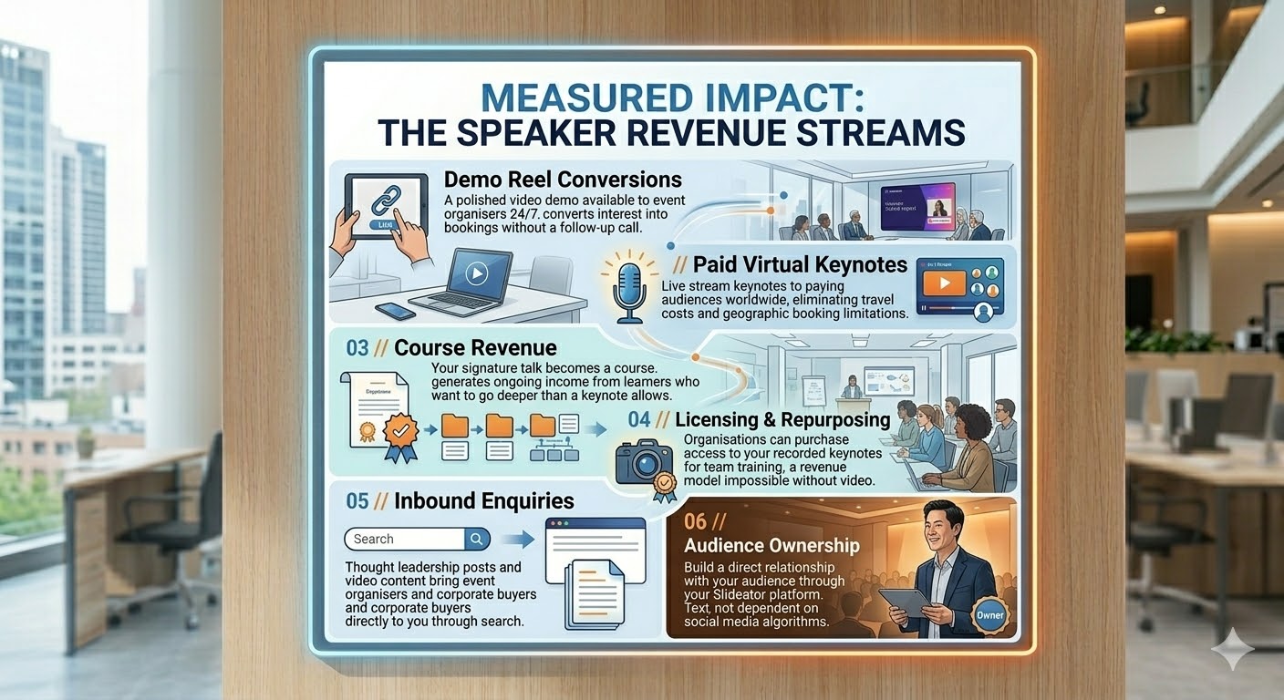 - Licensing & Repurposing — Organisations can purchase access to your recorded keynotes for team training — a revenue model impossible without video.