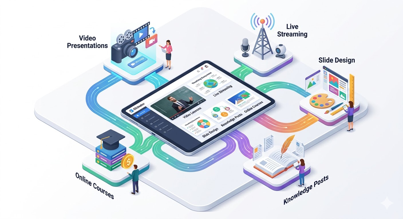 Slideator gives educators a single, powerful platform to create professional video presentations, design structured slide decks, live stream lessons, publish learning posts, and sell full online courses — all without juggling multiple tools.